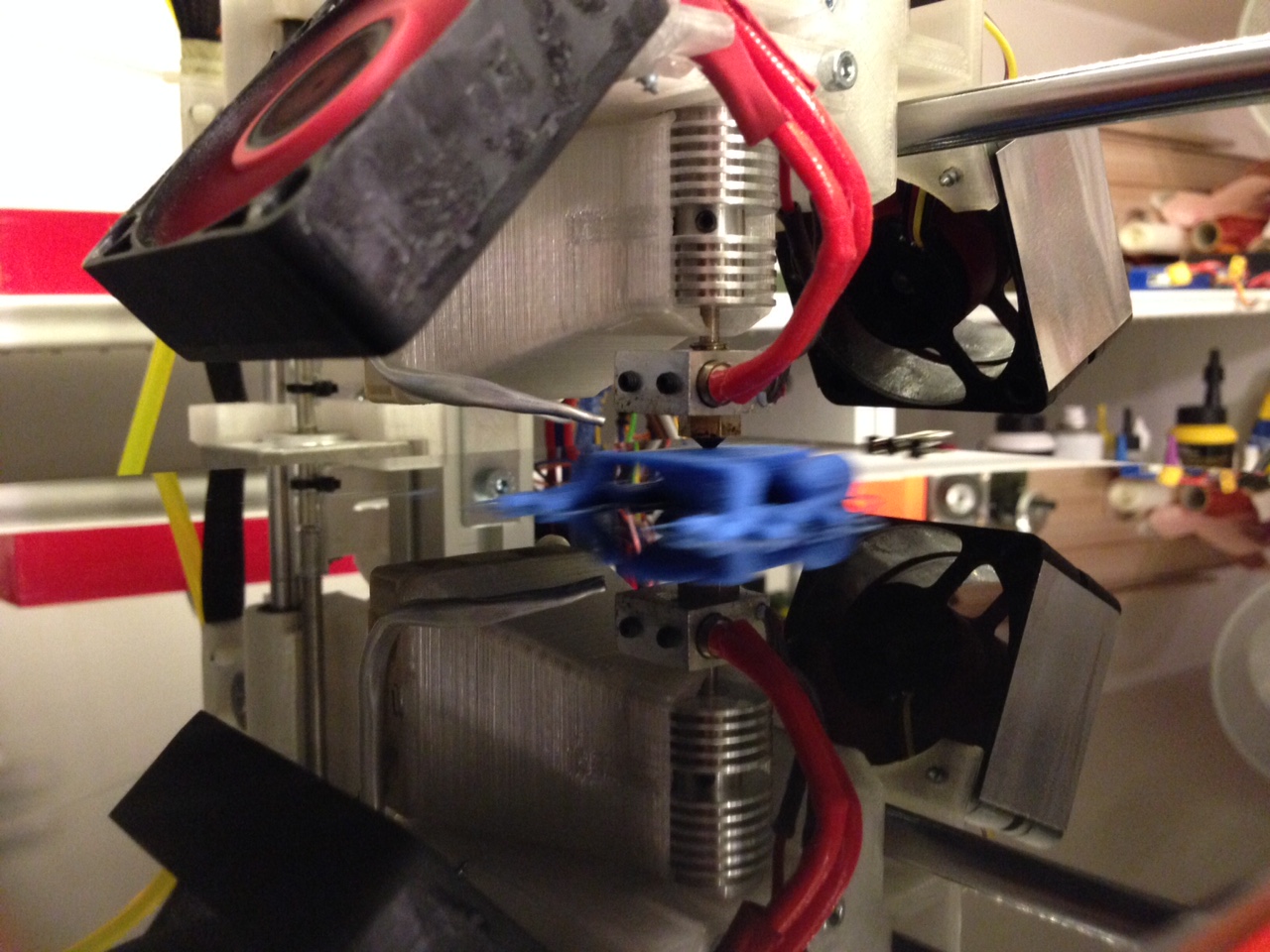 stále jsem zkoušel různé nástavce na ventilátory pro chlazení tisku z PLA, ale nedařilo se. Jakýkoli přípravek totiž výrazně snížil výkon ventilátoru. Nakonec se mi osvědčilo ofukování zdvojenými 50 mm ventilátory z obou stran bez jakýchkoli udělátek. Topení hlavy si s tím poradí do 268°C, výše to už nejde. Mám v plánu zaizolování kostky s hotendem, ale není to zatím nutné.
