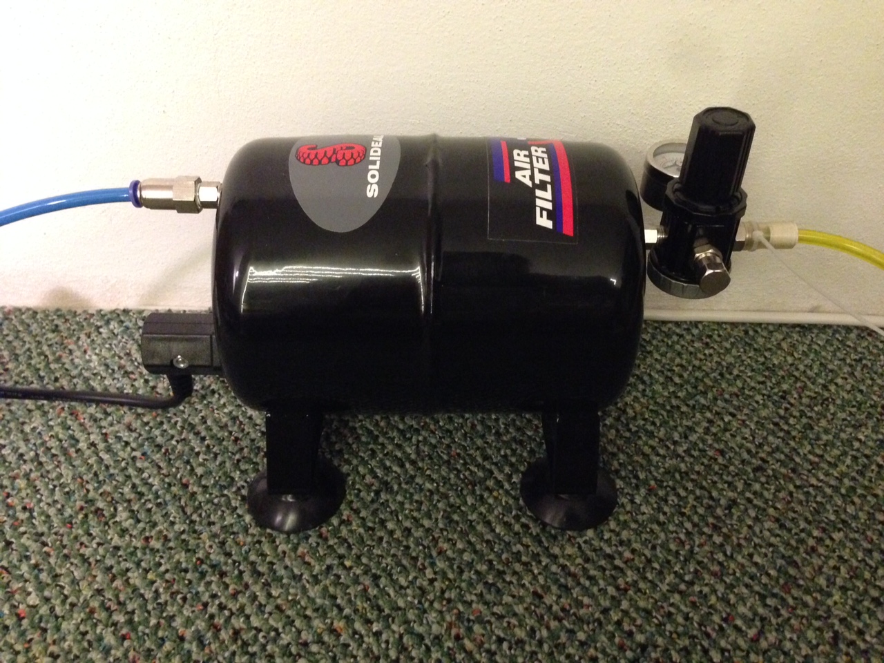 Ten tam mám, je to třetí fotka shora v tomto vlákně. Je to o nastaveném tlaku, aby to foukalo slušně. Pak mi to spíná častěji, jinak to docela jde. Bez toho by kompresor pracoval neustále.