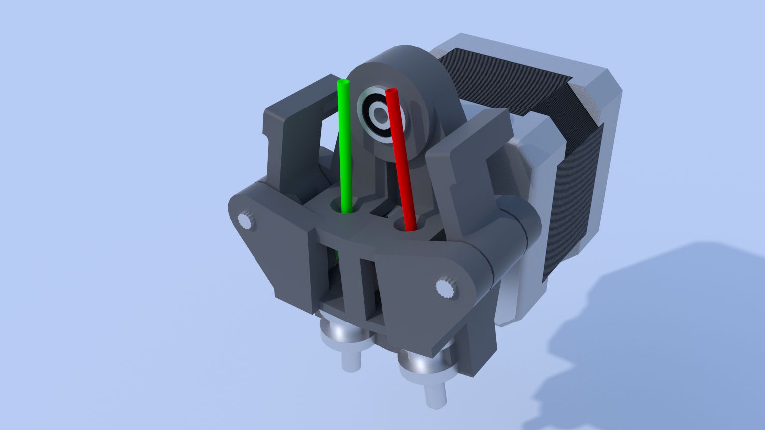 Páčky s ložisky, přidržující filament, jsem navrhl bez pružin, jelikož už se tam nevejdou. Navrhl jsem proto jiné řešení a to, že přítlak a napružení páčky bude prováděno pomocí klínu (na obr chybí zatím), který se strčí mezi páčku a kolíbku. Klín bude vroubkovaní a ještě bude mít v kolíbce drážku (nebo bude mít z boku náběhy), takže by se neměl samovolně uvolnit. Ještě není na obr protikus na držení extruderů.