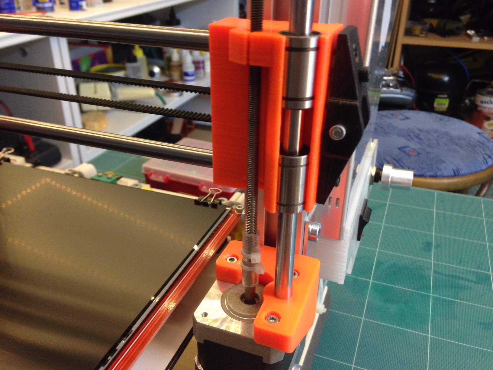 Motory Z posunu úplně dolů až k rámu (o 11,7 mm) a tyče pojezdu Z tím pádem budu posouvat také dolů, celkem o 25,7 mm. Zatím mám mezi hlavou a základnou pojezdu X takový mezikus, což také není úplně dobré - zmenšuje se tím mechanická tuhost. Udělám si tedy novou základnu.