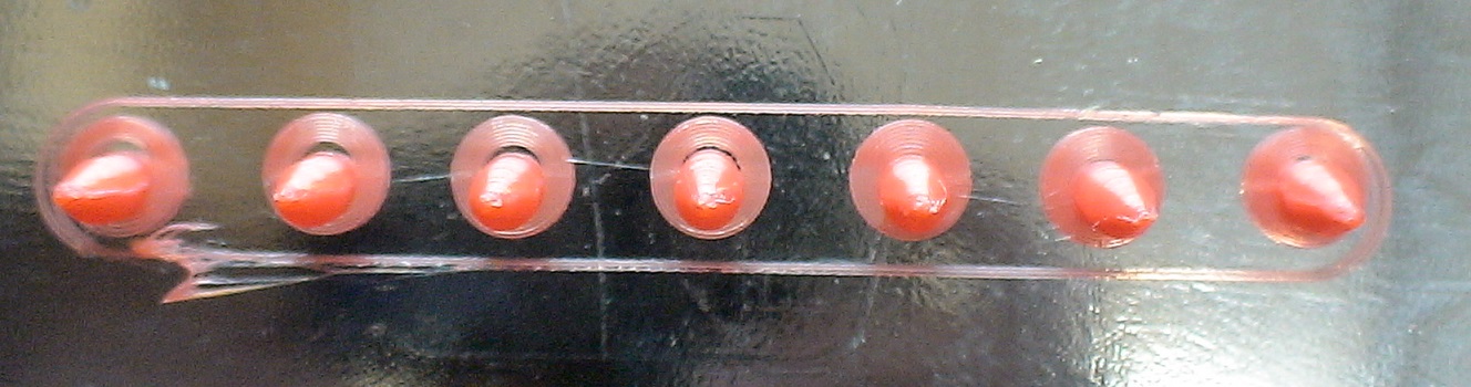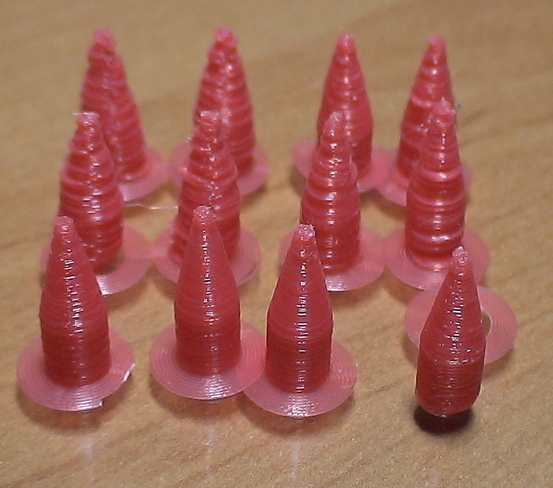 Z nějakýho neznámýho důvodu je přední řada OK ale zadní dvě naprostá katastrofa. Tryska 0.3 mm, 230 st chlazení na plný pecky, pouze 3 perimetry bez infil. Je to znásobenej jeden kousek x 11 v Repetier-hostu a v pravidelným rastru jak si to naskládal sám. Divný taky je, že brim je přesně v rastru ale 3 kousky jsou celý od druhý vrstvy posunutý cca 2 mm mimo osu kruhovýho brimu. :shock: Ta přední povedená řada je v rastru naprosto přesně. Takže posun o vynechání kroků některý osy to není. Zkusím to přeslicovat, případně seřadit do jedné řady ale zatím mě vůbec nenapadá, čím by to mohlo být. :roll: