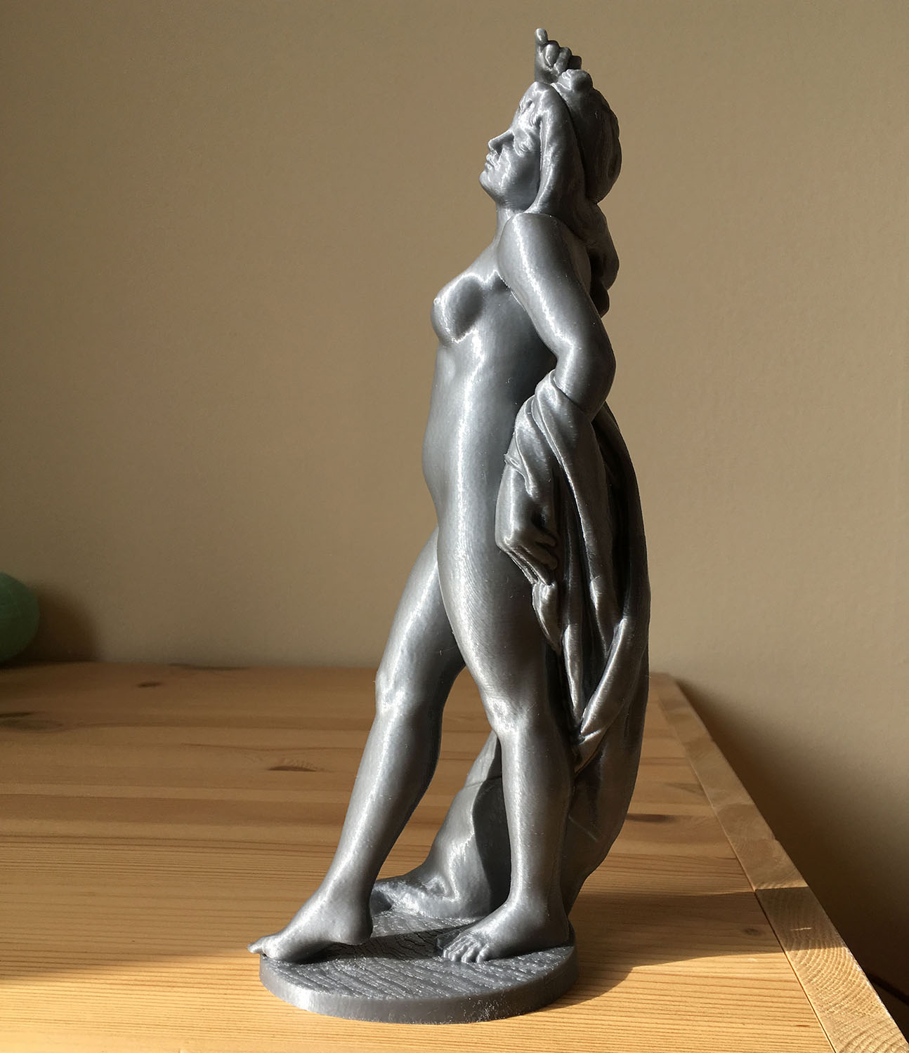 Soška se tiskla kolem 5 hod., vrstva 0,16 mm. Vytiskl jsem původní z Thingiverse a pak ještě vyhlazenou s redukcí polygonů na třetinu. Ta vypadá díky vyhlazenému povrchu lépe, ovšem ztratily se tím detaily.