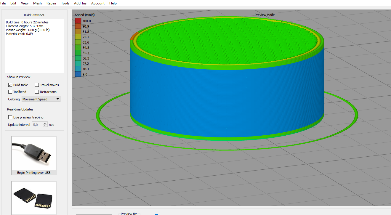 Vnitřní výplně a perimetry 80mm/s, venkovní perim. 30 mm/s, plné výplně 40 mm/s.