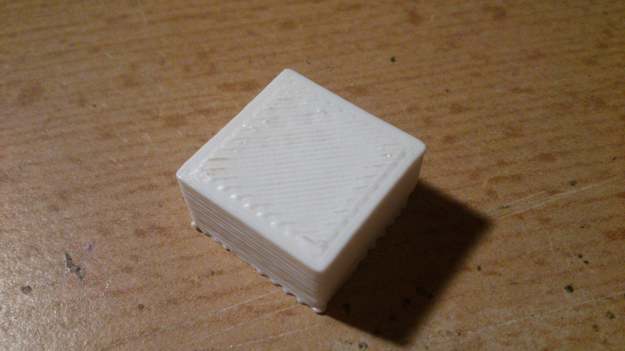 Tak konečně mi to v pohodě tiskne. První čtvereček dopadl nehezky, protože byl nízko endstop Z a tryska do toho doslova ryla (jde to dost dobře vidět, hlavně na té poslední vrstvě).