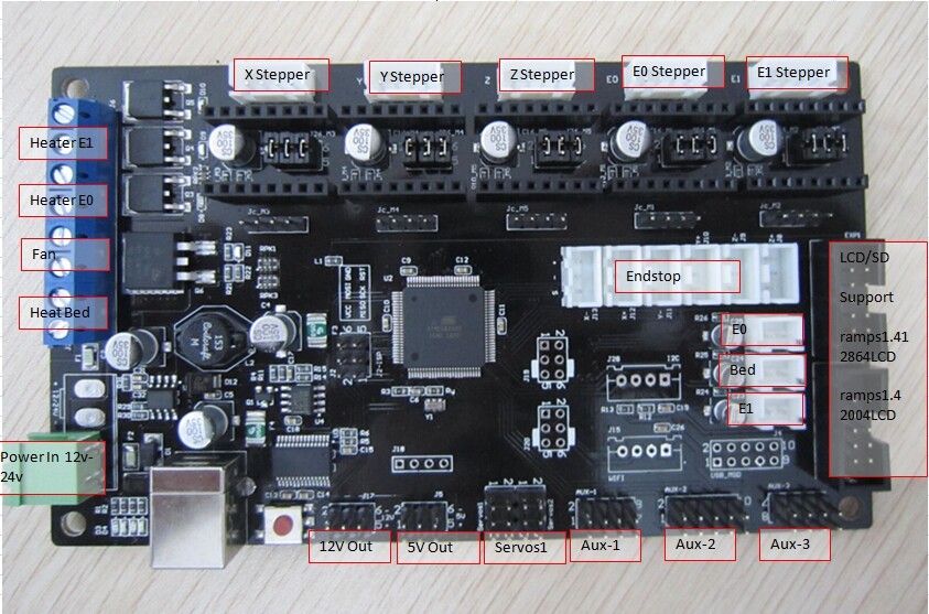 Ma integrovany presnejsie spolu Ramps1.4/Mega2560, ale ma aj integrovany vystup na sd kartu a GLCD (ktomu sa este vratim), 5 vyvod pre motorov (kazdy ma len jeden vystup), Endstopy min a max pre vsetky osy, termistory pre podlozku aj pre dvoch tryskach. ma zvlast Fan vyvod aj dve vyvody pre tryskach