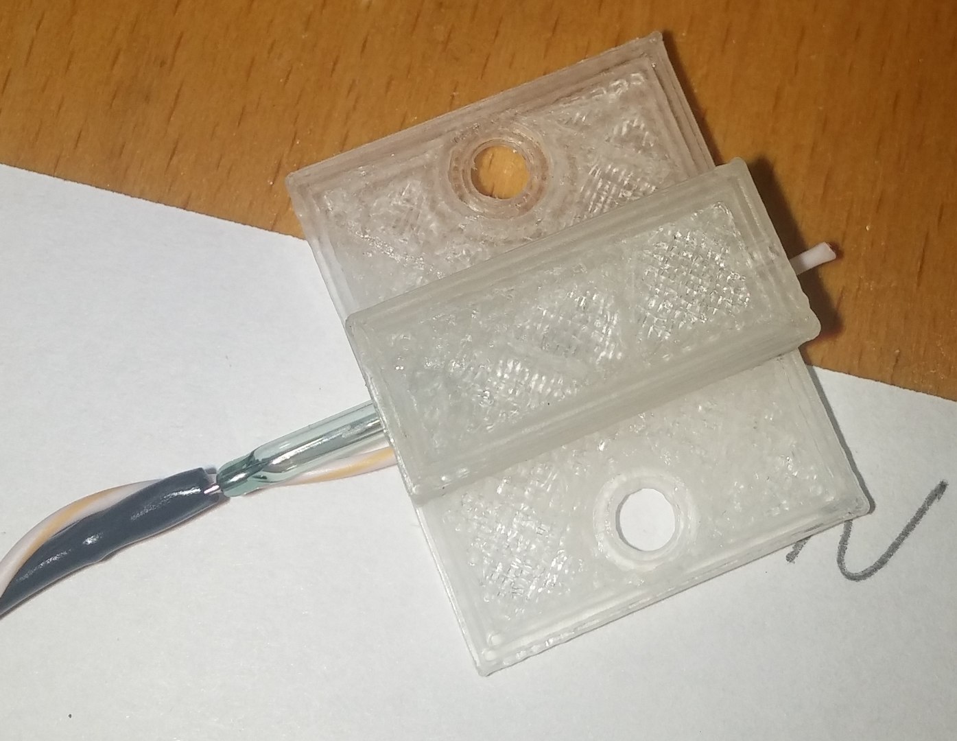Pres vikend jsem si postavil trochu jine reseni. Je to nezavisly sledovac otaceni civky s filamentem. Pokud se civka prestane otacet, privod 230V pro napajeni tiskarny se vypne. Je to jakysi "hlidaci pes" (watchdog), sledujici pulsy z otaceni civky. Jeden puls za otacku civky. Do civky je strceny maly drzacek s neodymovym magnetem (5 mm). Do drzaku civky pak pridan "reed kontakt". (Podobne snimani otacek/rychlosti pouziva napr. cyklo-kompik - tachometr na kolo). Signal jde do elektroniky - maly 8mi pinovy Atmel ATtiny85, oveseny indikacnimi LEDkami a optotriakem MOC3083 + triakem BTA140 jako silovym spinacem 230 V.