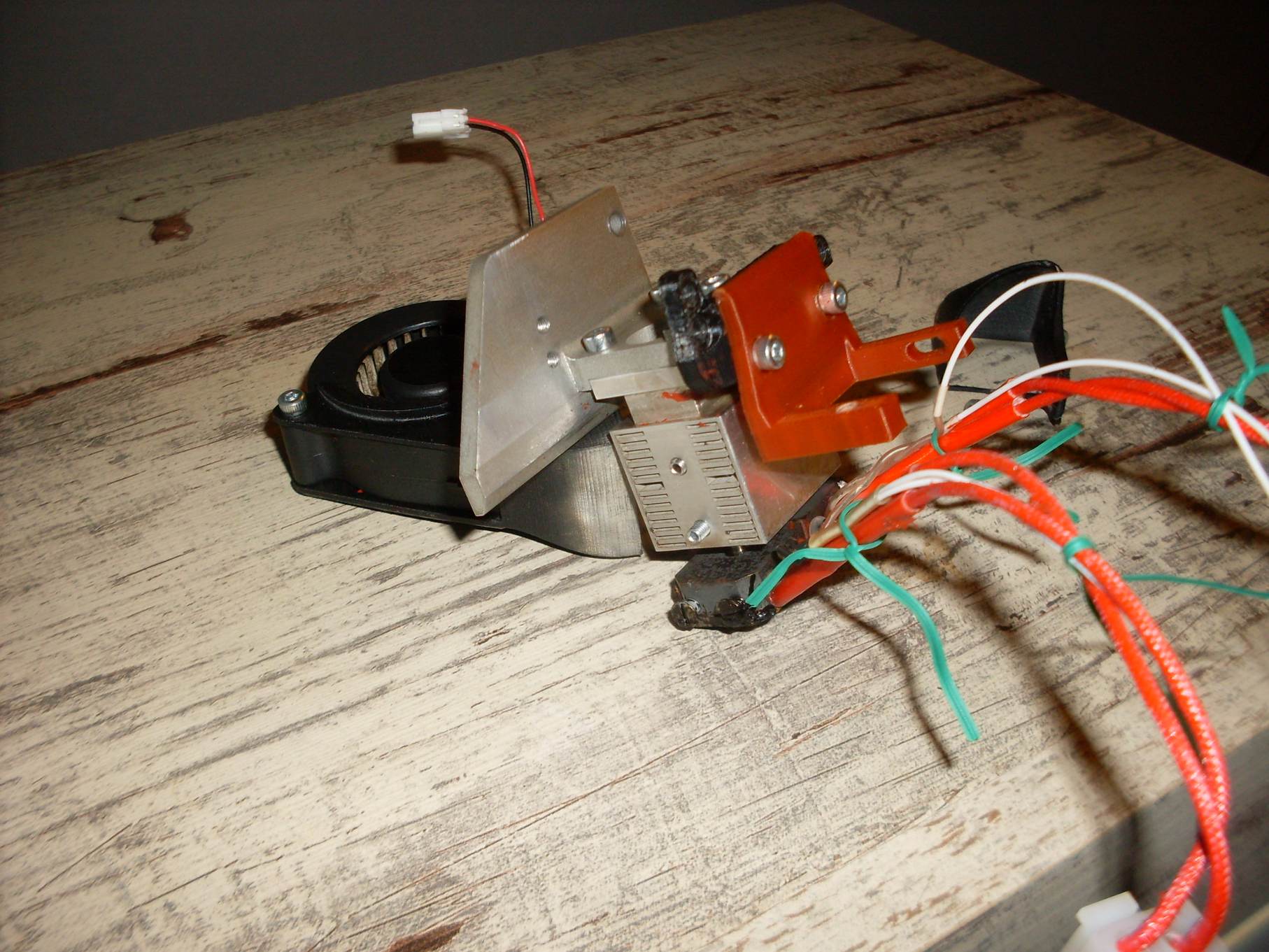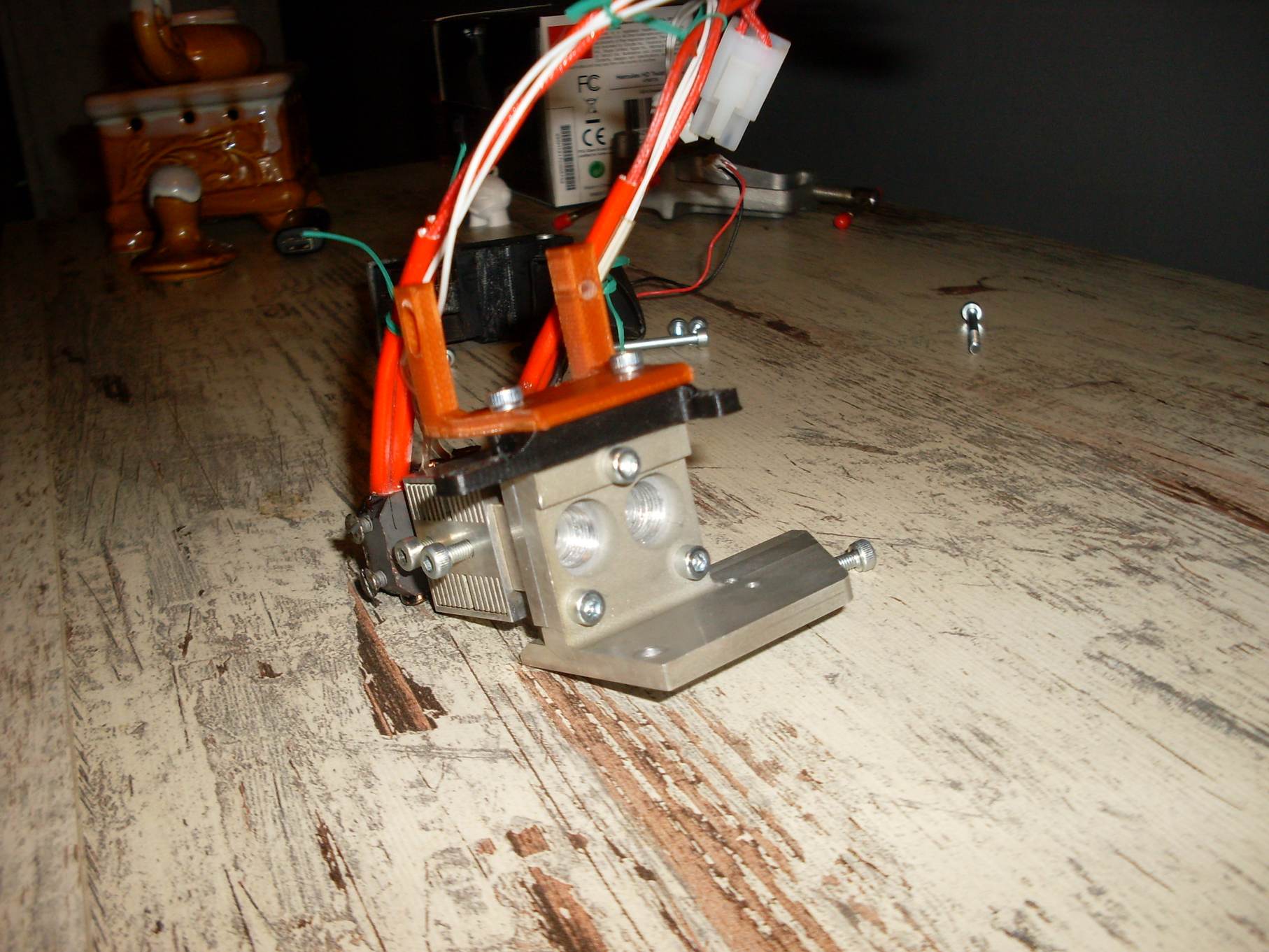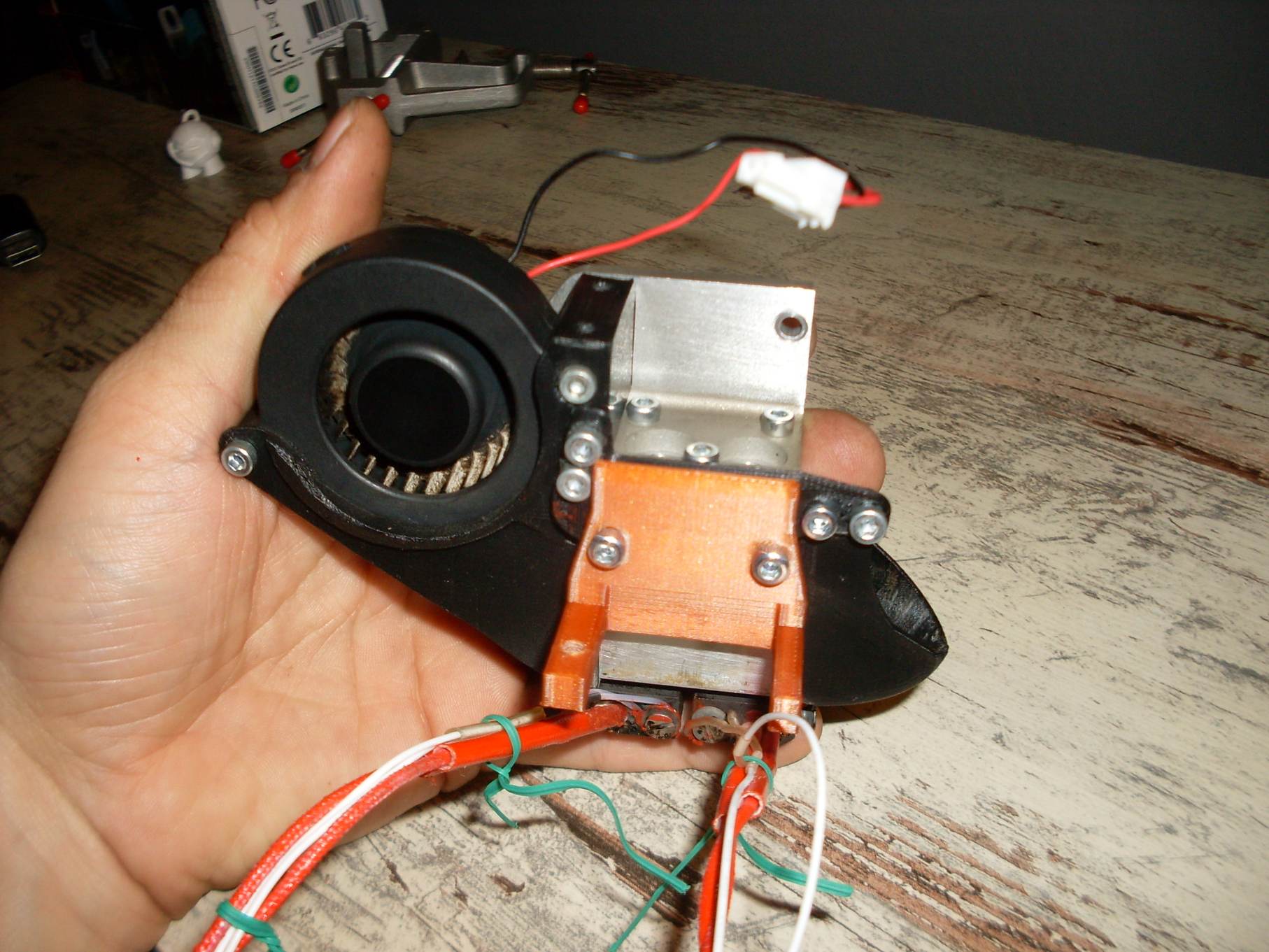 obidva HE majú spoločný hliníkový chladič (nie duralový - opäť kôli tepelnej vodivosti).jeho konštrukcia je celá podriadená zabráneniu akéhokoľvek fúkaniu chladiča HE na práve tlačené ABS.je celý uzatvorený a má výfuk smerovaný do hora.jeden HE (0,4) je pevný, ten je pritiahnutý dvomi červíkmi zo strany ventilátora.druhý - na strane výfuku - sa dá kedykoľvek jednoducho dvomi skrutkami výškovo nastaviť.