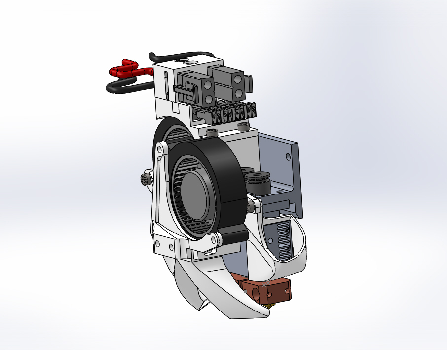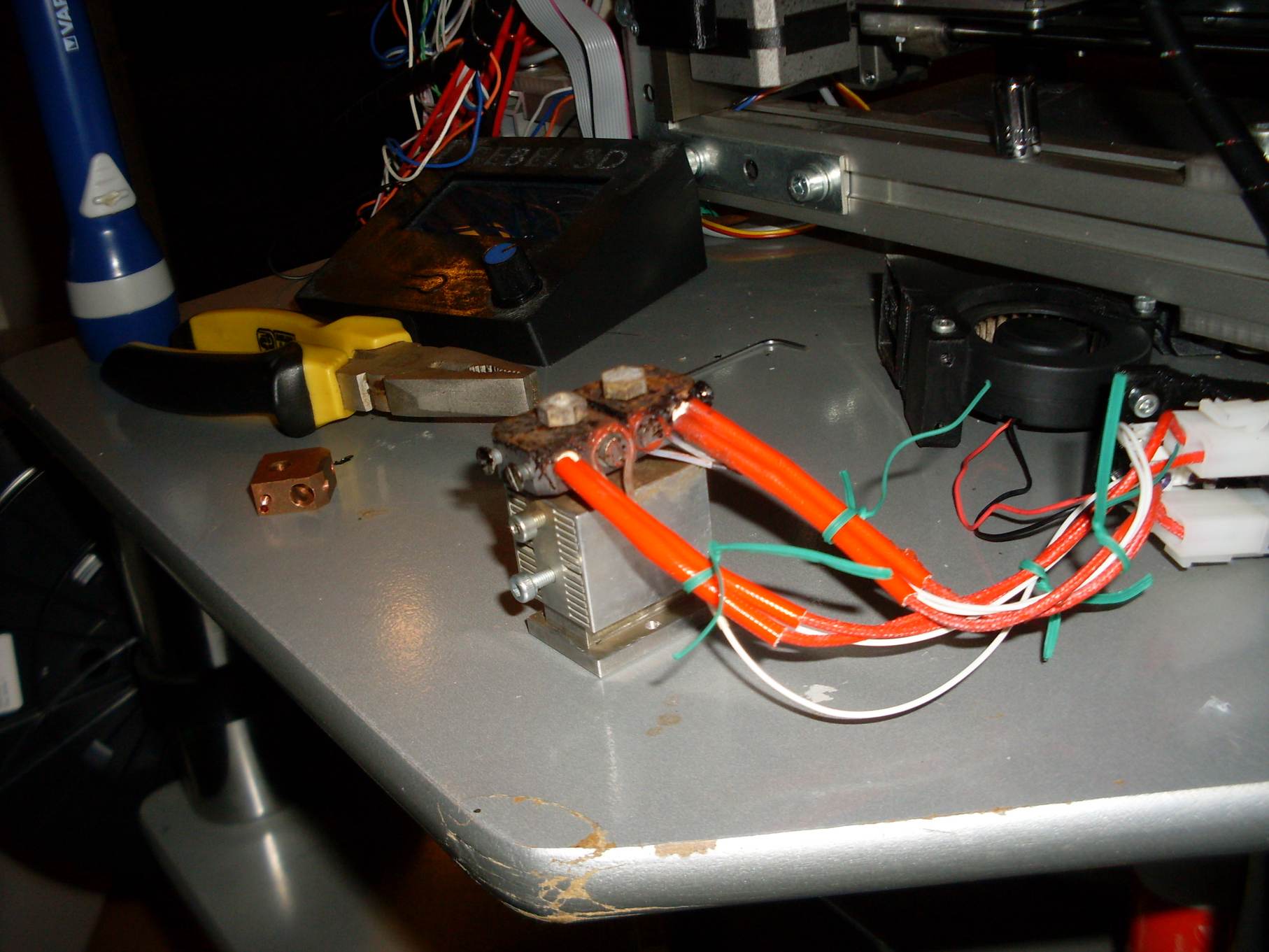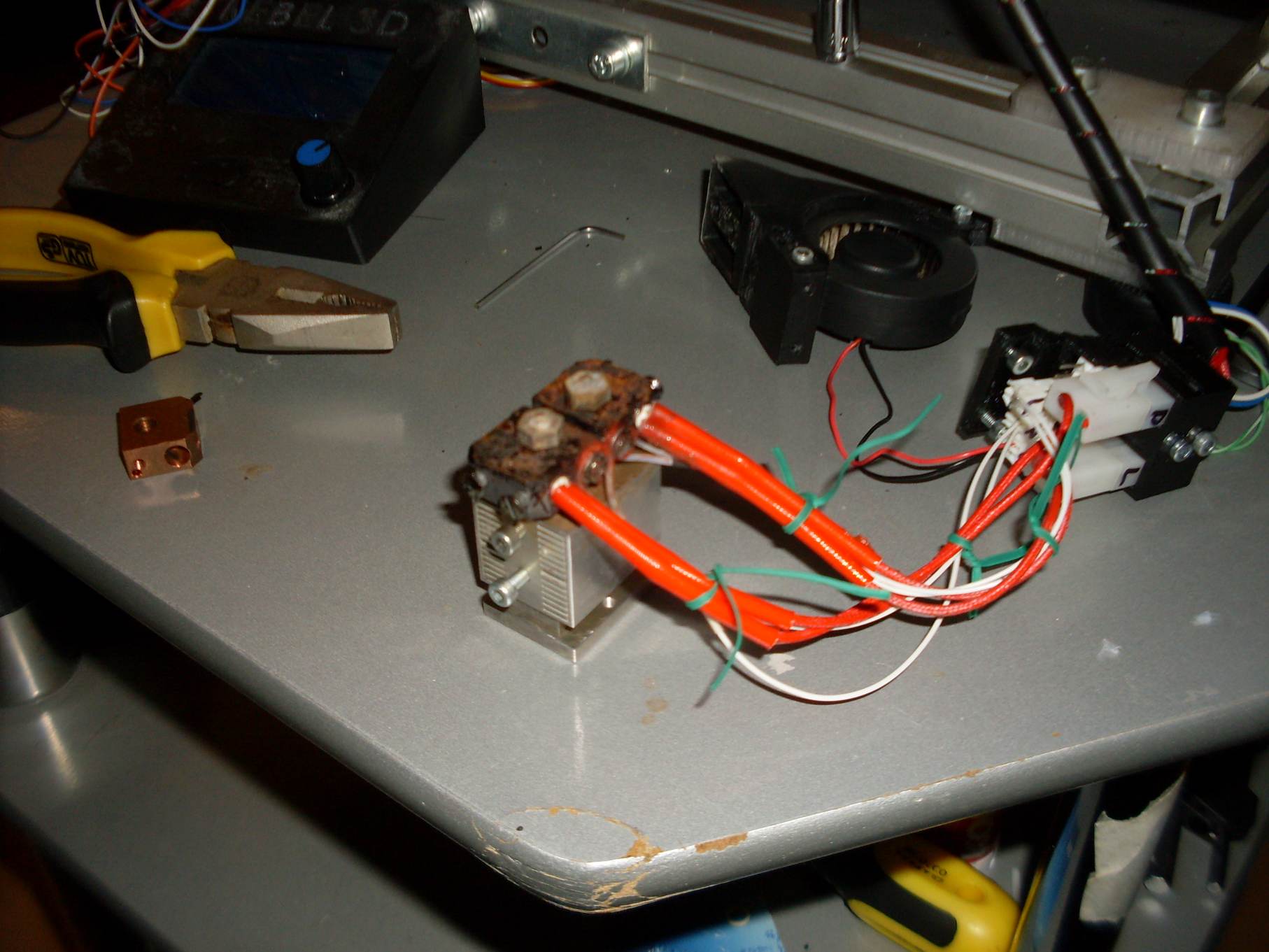 obidva HE majú spoločný hliníkový chladič (nie duralový - opäť kôli tepelnej vodivosti).jeho konštrukcia je celá podriadená zabráneniu akéhokoľvek fúkaniu chladiča HE na práve tlačené ABS.je celý uzatvorený a má výfuk smerovaný do hora.jeden HE (0,4) je pevný, ten je pritiahnutý dvomi červíkmi zo strany ventilátora.druhý - na strane výfuku - sa dá kedykoľvek jednoducho dvomi skrutkami výškovo nastaviť.