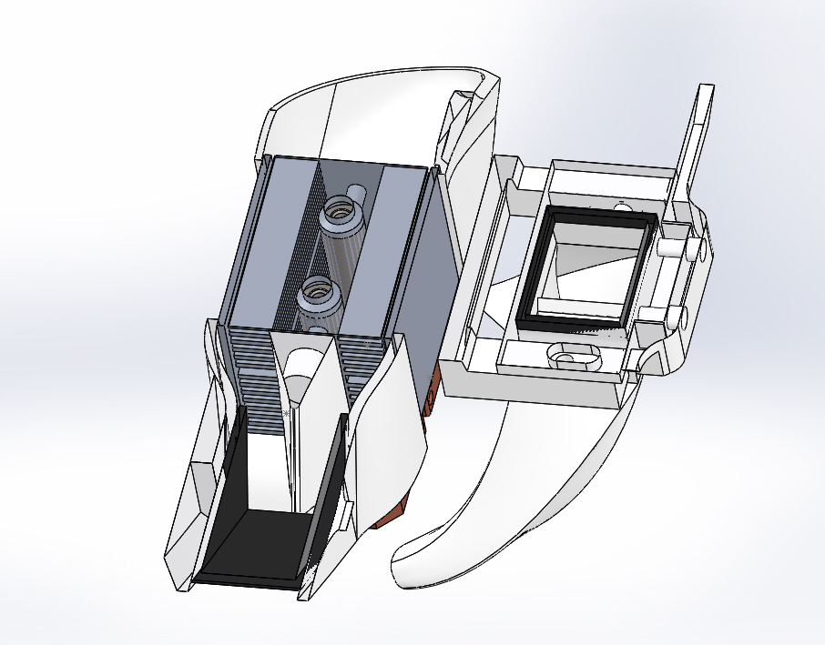 celok sa celý nasadí na trojdielnu "kostru".blok HE+hliníkový pasív sa dá z hlavy vymontovať a zamontovať nazad bez nutnosti opätovného vyrovnávania alebo nastavovania Z endstopu.pre túto vlastnosť dôležité komponenty sú presne obrábané z kovu.keď mám 2 skompletované bloky HE+pasív a obidva už boli založené na vozíku a trysky vyrovnané, môžem ich pomocou 4 konektorov a 5 skrutiek za chvílu medzi sebou vymeniť taktiež bez nutnej kalibrácie a vyrovnávania.stačí prehrať eeprom.