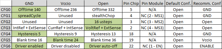 Z datasheetu a destičky jsem vyzkoumal, že driver má ve výchozím stavu všechny CFG piny "open". To je ale dost proti doporučené konfiguraci z datasheetu, viz tabulka v příloze.