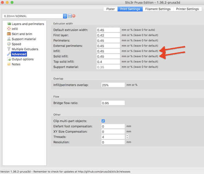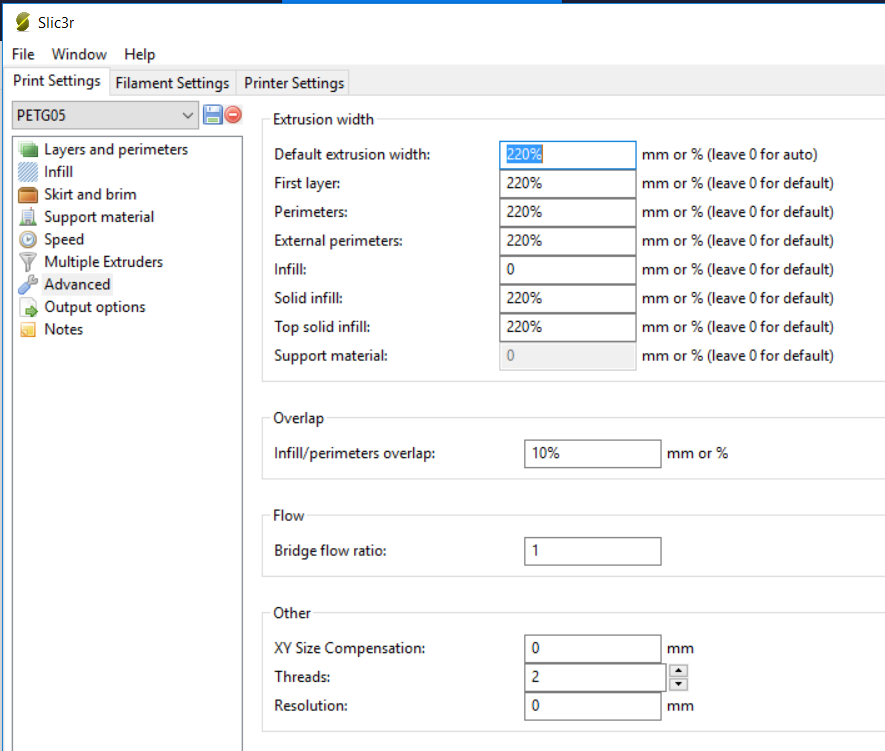 220% z 0,2mm vrstvy je 0,44 širka extruze. za pokus nič nedáš. nastav výšku vrstvy 0,2 a všade daj 220%, okrem infilu