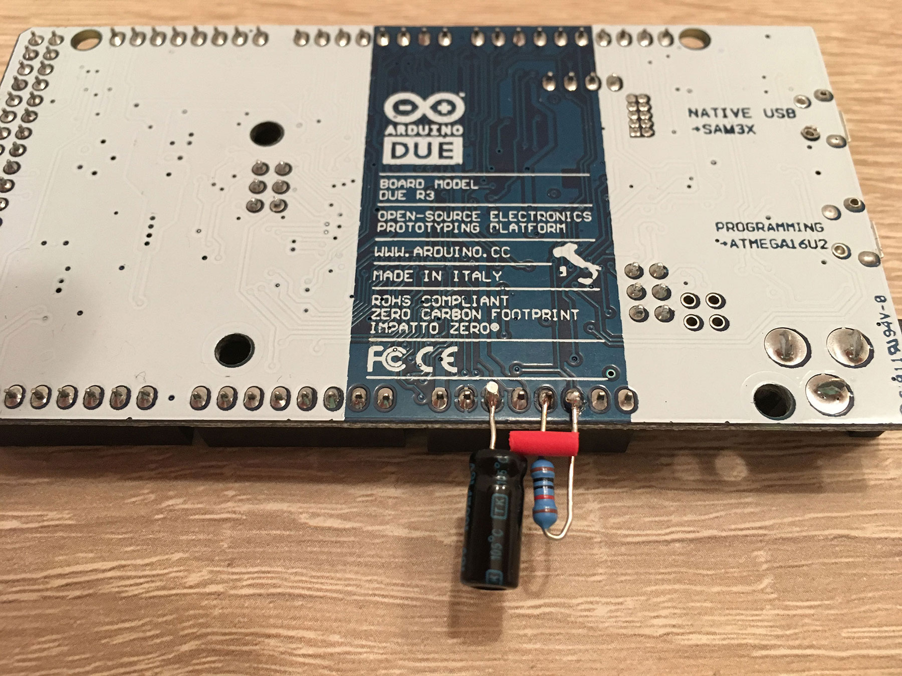 Ještě zde zveřejním malou úpravu Arduina. Po zapnutí zdroje Arduino DUE s RADDS deskou nenaběhne, je třeba stisknout Reset. Toto lze vyřešit přidáním rezistoru 10k a kondenzátoru 100uF na Reset pin, viz fotky.