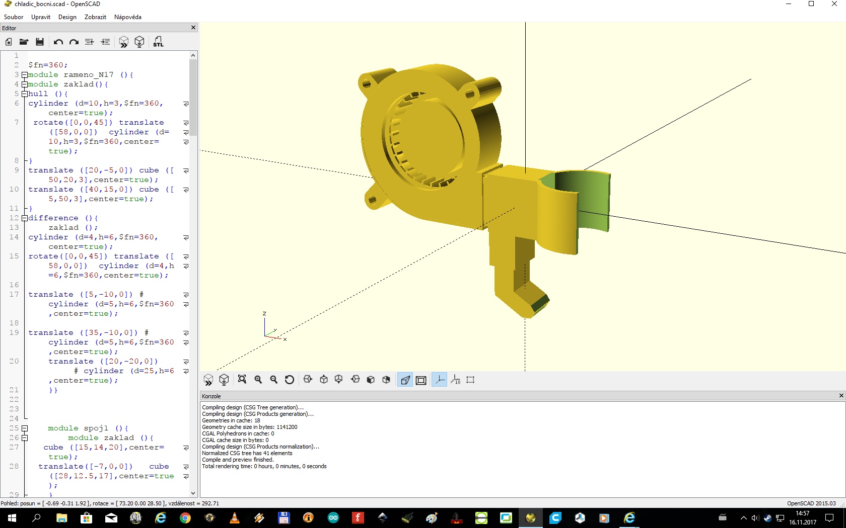 Ja chvalim - konecne nekdo kdo pouziva OpenSCAD. Jenom jsem si na nej musel poridit vykonejsi pocitac, jelikoz u vetsich objektu uz fakt nebyl pohyb modelem plynuly.