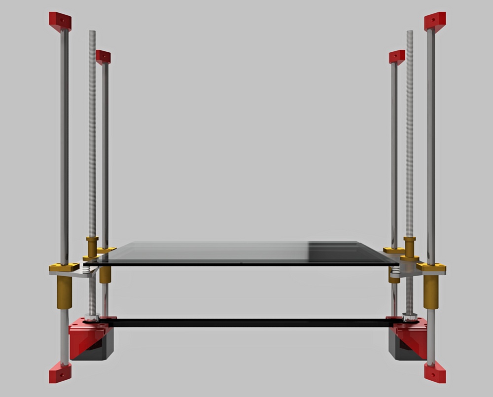 Jojo, to tvoje je klasické řešení, když se udělá poctivě, tak je hodně stabilní a řekl bych i nenáročné na přesnost skříně, ale docela náročné na prostor. Proto jsem tam dal heatbed podepřený na obou stranách, což je ale zase náročné na přesnost skříně, protože vodící tyče jsou spojeny přes plech heatbedu. Tak jsem plech pod heatbedem rozdělil na dva, popravdě jsem nenašel důvod, proč by měl být spojený (snad jen možnost podepřít heatbed pružinama i v polovině, ne jen na krajích).