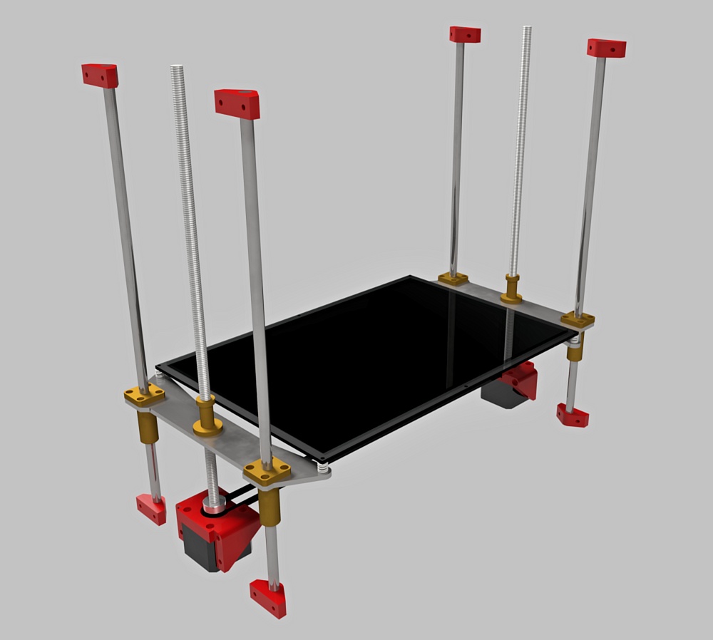 Ty dva motory jsou naprosto zbytecne, dej tam jen remenici. Prevod na sroubu je takovy, ze kdyz jsem to pocital s kulickovym sroubem se stoupanim 4mm, vyslo mi ze jeden NEMA17 uzvedne na stolku cca 60kg. Trapez ma horsi ucinnost, ale zase mensi stoupani, takze bych to tipoval podobne (nechce se mi to pocitat). Ty prostredni srouby bych tam dal, ja mel bed (3mm hlinik) mirne prohly i za studena, co to delalo po zahrati jsem uz nemeril a radeji to pritahl prostrednim sroubem.
