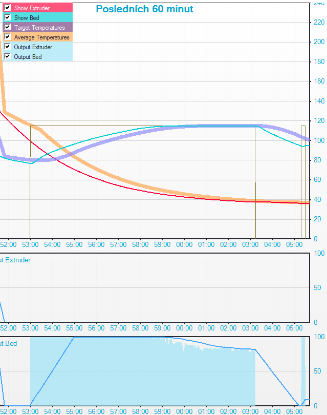 Tisknul jsem a cca po 2,6 mm výšky výtisku mě tisk skončil červeným oknem na problém teploty podložky. No nic, založil jsem znovu a opět ve stejném čase tentýž problém. Zkusil jsem to ještě jednou a zase. Vždycky cca 2,5 - 3,00 mm výšky výtisku. Koukal jsem na nahřívání, dioda svítila a po dosažení teploty blikala i když tiskárna již byla vypadlá. Teploměrem jsem zjistil, že podložka je stále nahřátá na 115 stupňů. Tomu odpovídá i graf teploty, kde nebyl žádný skok a měřil stále dál i když tiskárna nejela. Jedině graf output Bed klesal viz přiložený obrázek, potom jsem to vypnul. Nevím co tento graf říká? Křivka nahřívání drží krásně rovinu.