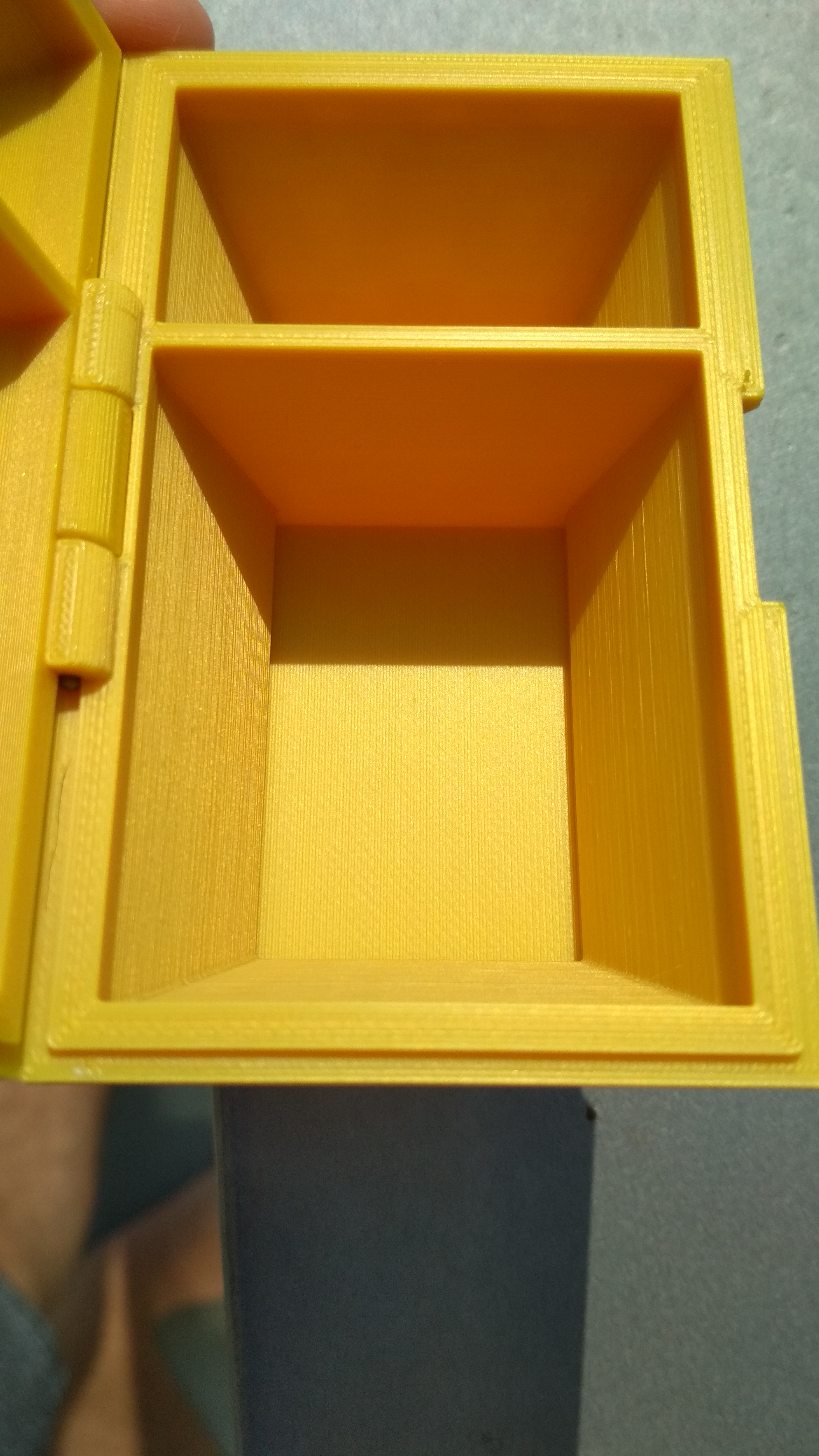 Víko se tiskne obráceně, normální tryska to nezvládla, došlo k rozpatlání rohů. V případě niklové trysky je výsledek ok.