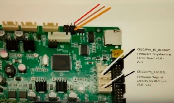 "How to install a BLTouch on a CR-10s Pro UPDATED" (viz výše). Použijte jej jen jako návod pro mechanické práce. Jak jsem zjistil, výrobce/prodejci vám mohou dodat různé modifikace kabeláže a držáků senzoru. Proto jsem si nejdříve vytiskl svůj držák senzoru (viz příloha). Takže vám v krabičce zbyde nejen kovový držák, ale i USB interface a různé nástavce do portů, které neupotřebíte. Z balení jsem použil jen jeden pár delších šroubků. Co ale v balení není, je tzv. propojka pinů, která se používá např. na základních deskách v PC.