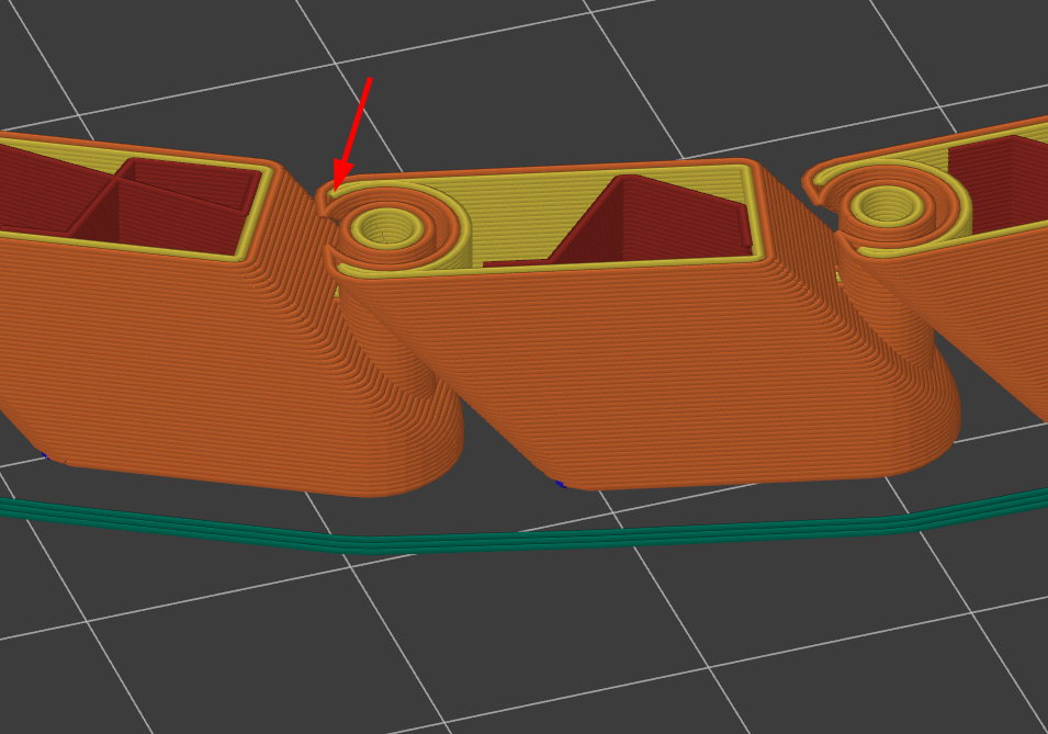 Celý pás při 15% chlazení je nevytisknutelný. Problém je při tisku oblouku, který je přerušený tj. ještě není celý. Tam se plast zkroutí a zvedne. Po čase o to víc drcne hlava a utrhne celý článek z plochy ... , viz obrázek.