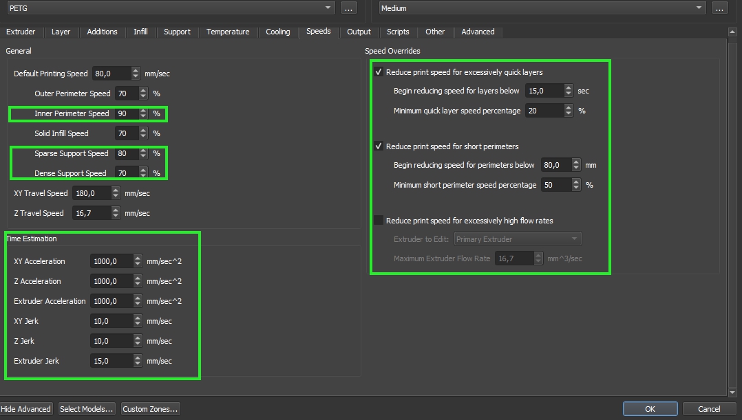 Potlačení rychlosti při krátkém čase vrstvy (Speed overrides) dostalo nastavení pro zpomalení obvodů a u vysokého průtoku.