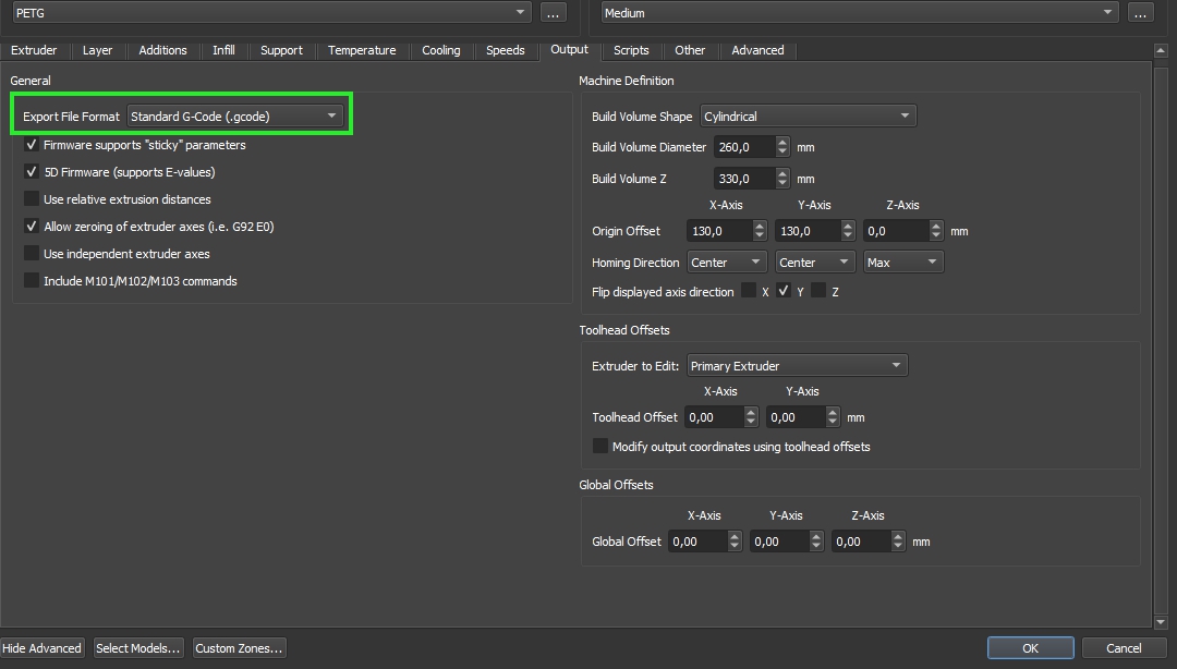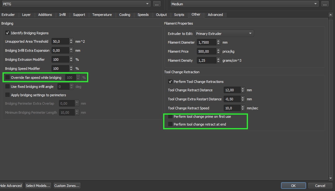 U chlazení přibylo číslování ventilátorů. V Gcode je definováno parametrem P. Pokud toto firmware tiskárny neumí , je třeba do záložky Scripts>Postprocesing vepsat: {REPLACE " P0\n" "\n"}