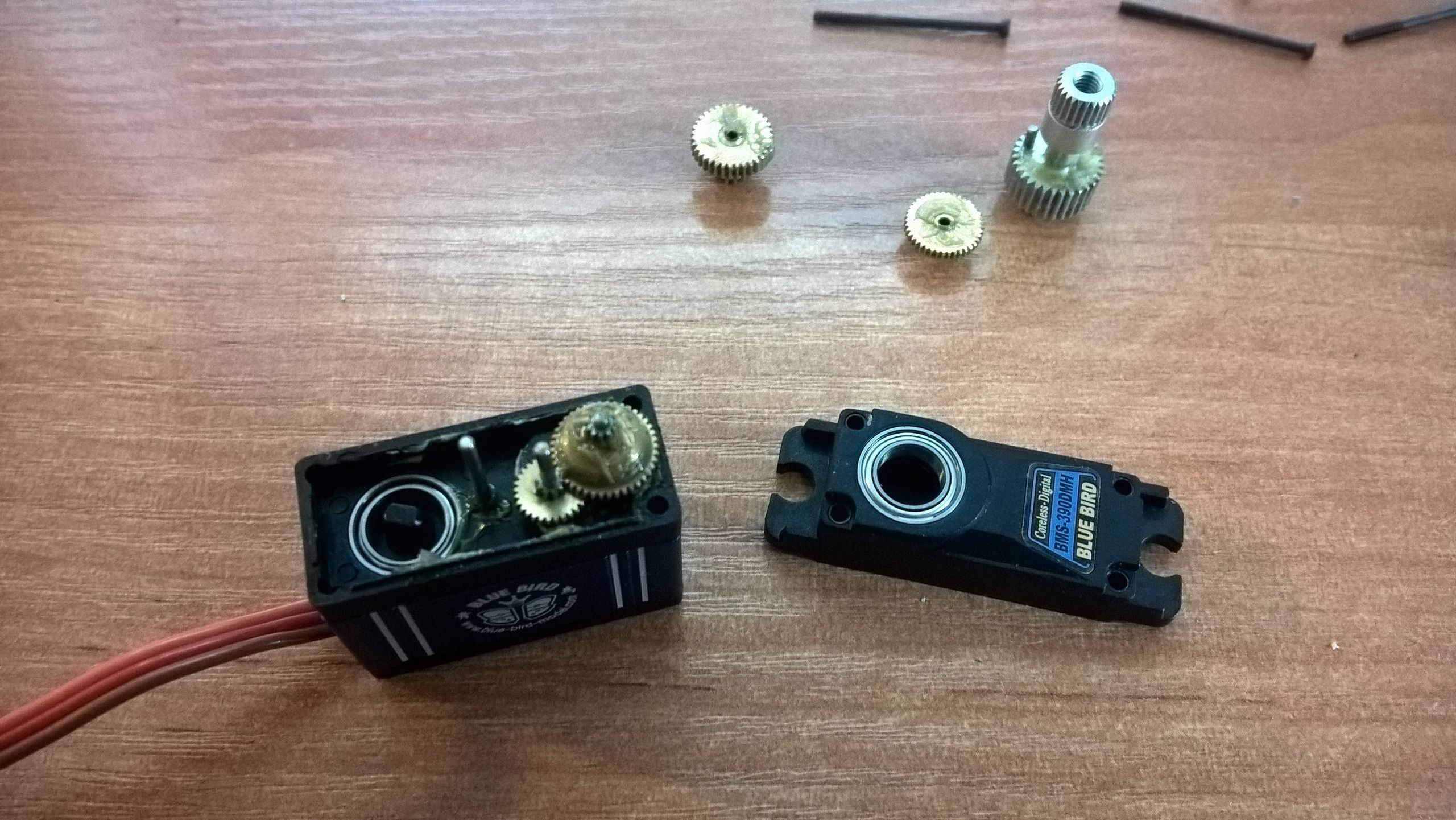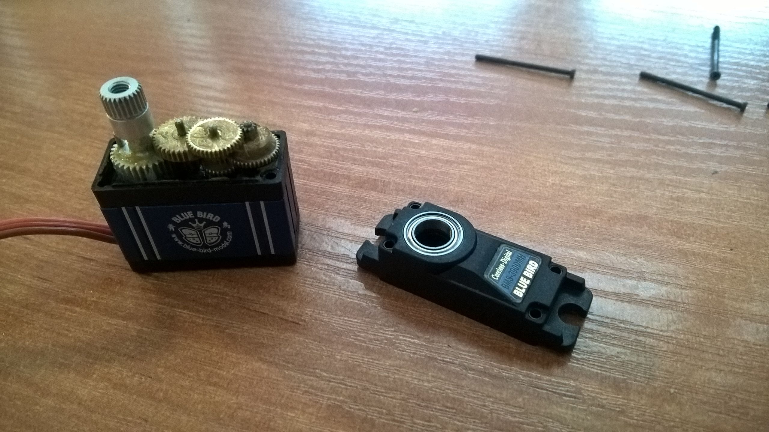 Takže už mi dorazily díly a z pastorku jsem nadšený. Teďka už pastorek (zubetice) nehobluje, teďka rovnou přeskakuje motor :D. Co se týče serva jsem spokojen, je silné, má všechny ozubená kola kovová a má doopravdy 2 ložiska (jedno nahoře a druhé dole). Jediné mě trochu zaskočilo, že umí pouze +-60°, takže budu muset poupravit excentr, abych dohnal těch 30°. Dávám sem ještě obr (snad to nebude nikomu vadit).