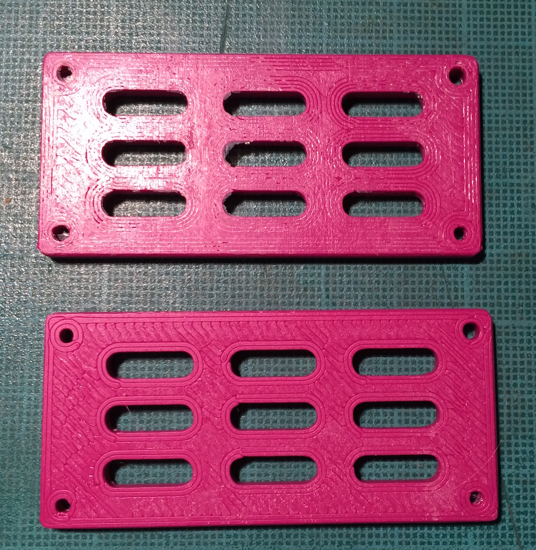 edit: Mě z toho snad klepne! Protože při tisku vznikla nepoužitelnost hlavně kolem chladících oválů, upravil jsem počet oválů a tady je výsledek. Nepovedený díry v rozích a ty ovály je top perimetr. Strašný :x Vůbec netuším, co se děje. Díry mají průměr 2 mm, ovály 12x4 a celý 60x25mm.